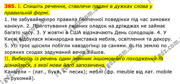 І. Спишіть речення, ставлячи подані в дужках слова у правильній формі. 1. Не забуваймо про правила безпечної поведінки під час зимових канікул. 2. Приготування пишних оладок на дріжджах не займає багато часу. 3. У жовтні в США відзначають День солодощів. 4. У Києві відбулася міжнародна виставка меблів, освітлення та декору. 5. Усі троє щосили побігли навздогінці за санями. 6. На землю по зоряних сходах задуманий вечір зійшов. II. Виберіть із речень один іменник іншомовного походження та дізнайтеся, з якої мови його запозичено. Канікули – (лат., букв. — песик); меблі (фр. meuble від лат. mobile — рухомий).