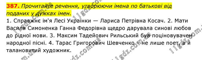 Прочитайте речення, утворюючи імена по батькові від поданих у дужках імен. 1. Справжнє ім'я Лесі Українки — Лариса Петрівна Косач. 2. Мати Василя Симоненка Ганна Федорівна щедро дарувала синові любов до рідної мови. 3. Максим Тадейович Рильський був поціновувачем народної пісні. 4. Тарас Григорович Шевченко – не лише поет, а й талановитий художник.
