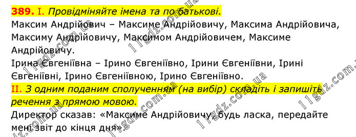 І. Провідміняйте імена та по батькові. Максим Андрійович – Максиме Андрійовичу, Максима Андрійовича, Максиму Андрійовичу, Максимом Андрійовичем, Максиме Андрійовичу. Ірина Євгеніївна – Ірино Євгеніївно, Ірини Євгеніївни, Ірині Євгеніївні, Ірино Євгеніївною, Ірино Євгеніївно. II. З одним поданим сполученням (на вибір) складіть і запишіть речення з прямою мовою. Директор сказав: «Максиме Андрійовичу, будь ласка, передайте мені звіт до кінця дня».