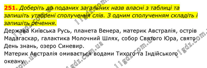 Доберіть до поданих загальних назв власні з таблиці та запишіть утворені сполучення слів. З одним сполученням складіть і запишіть речення. Держава Київська Русь, планета Венера, материк Австралія, острів Мадагаскар, галактика Молочний Шлях, собор Святого Юра, свято День знань, озеро Синевир. Материк Австралія омивається водами Тихого та Індійського океану.