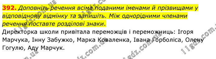 Доповніть речення всіма поданими іменами й прізвищами у відповідному відмінку та запишіть. Між однорідними членами речення поставте розділові знаки. Директорка школи привітала переможців і переможниць: Ігоря Марчука, Інну Забужко, Марка Коваленка, Івана Горболіса, Олену Гогулю, Аду Марчук.