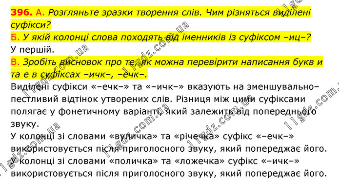 А. Розгляньте зразки творення слів. Чим різняться виділені суфікси? Б. У якій колонці слова походять від іменників із суфіксом –иц–? У першій. В. Зробіть висновок про те, як можна перевірити написання букв и та е в суфіксах –ичк–, –ечк–. Виділені суфікси «–ечк–» та «–ичк–» вказують на зменшувально–пестливий відтінок утворених слів. Різниця між цими суфіксами полягає у фонетичному варіанті, який залежить від попереднього звуку. У колонці зі словами «вуличка» та «річечка» суфікс «–ечк–» використовується після приголосного звуку, який попереджає його. У колонці зі словами «поличка» та «ложечка» суфікс «–ичк–» використовується після приголосного звуку, який попереджає його.