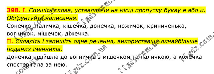 І. Спишіть слова, уставляючи на місці пропуску букву е або и. Обґрунтуйте написання. Сонечко, паличка, кішечка, донечка, ножичок, криниченька, вогничок, мішечок, діжечка. II. Складіть і запишіть одне речення, використавши якнайбільше поданих іменників. Донечка підійшла до вогничка з мішечком та паличкою, а колечка спостерігала за нею.