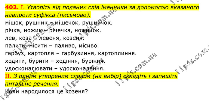 І. Утворіть від поданих слів іменники за допомогою вказаного навпроти суфікса (письмово). мішок, рушник – мішечок, рушничок. річка, ножик – річечка, ножичок. лев, коза – левеня, козеня. палити, місити – паливо, місиво. гарбуз, картопля – гарбузиння, картоплиння. ходити, бурити – ходіння, буріння. удосконалювати – удосконалення. II. З одним утвореним словом (на вибір) складіть і запишіть питальне речення. Коли народилося це козеня?