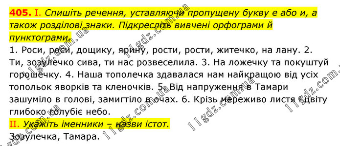 І. Спишіть речення, уставляючи пропущену букву е або и, а також розділові знаки. Підкресліть вивчені орфограми й пунктограми. 1. Роси, роси, дощику, ярину, рости, рости, житечко, на лану. 2. Ти, зозулечко сива, ти нас розвеселила. 3. На ложечку та покуштуй горошечку. 4. Наша тополечка здавалася нам найкращою від усіх топольок яворків та кленочків. 5. Від напруження в Тамари зашуміло в голові, замигтіло в очах. 6. Крізь мереживо листя і цвіту глибоко голубіє небо. II. Укажіть іменники – назви істот. Зозулечка, Тамара.