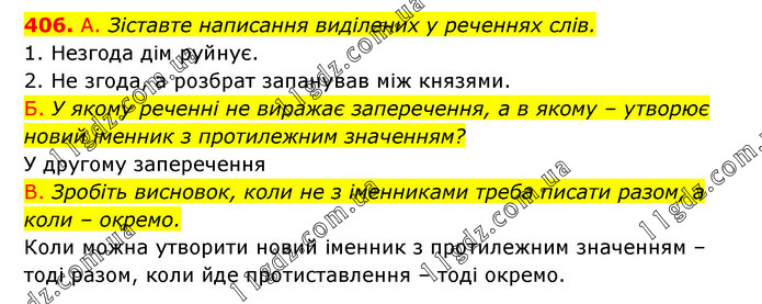 А. Зіставте написання виділених у реченнях слів. 1. Незгода дім руйнує. 2. Не згода, а розбрат запанував між князями. Б. У якому реченні не виражає заперечення, а в якому – утворює новий іменник з протилежним значенням? У другому заперечення В. Зробіть висновок, коли не з іменниками треба писати разом, а коли – окремо. Коли можна утворити новий іменник з протилежним значенням – тоді разом, коли йде протиставлення – тоді окремо.