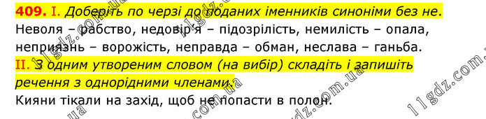 І. Доберіть по черзі до поданих іменників синоніми без не. Неволя – рабство, недовір’я – підозрілість, немилість – опала, неприязнь – ворожість, неправда – обман, неслава – ганьба. ІІ. З одним утвореним словом (на вибір) складіть і запишіть речення з однорідними членами. Кияни тікали на захід, щоб не попасти в полон.
