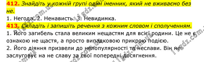412. Знайдіть у кожній групі один іменник, який не вживаємо без не. 1. Негода. 2. Ненависть. 3. Невидимка. 413. Складіть і запишіть речення з кожним словом і сполученням. 1. Його загибель стала великим нещастям для всієї родини. Це не є ознакою не щастя, а просто випадковою прикрою подією. 2. Його діяння призвели до непопулярності та неслави. Він не заслуговує на не славу за свої попередні досягнення.