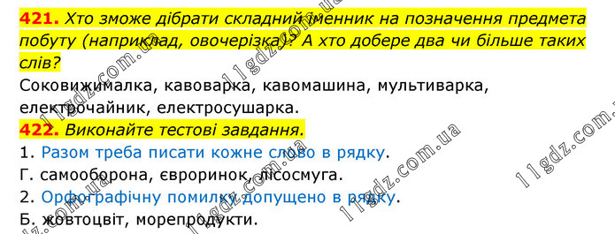 421. Хто зможе дібрати складний іменник на позначення предмета побуту (наприклад, овочерізка)? А хто добере два чи більше таких слів? Соковижималка, кавоварка, кавомашина, мультиварка, електрочайник, електросушарка. 422. Виконайте тестові завдання. 1. Разом треба писати кожне слово в рядку. Г. самооборона, євроринок, лісосмуга. 2. Орфографічну помилку допущено в рядку. Б. жовтоцвіт, морепродукти.