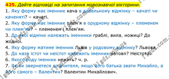 Дайте відповіді на запитання мовознавчої вікторини. 1. Яку форму має іменник кача в давальному відмінку – качаті чи каченяті? – качаті. 2. Яку форму має іменник плем’я в орудному відмінку – племенем чи плем’ям? – племенем і плем'ям. 3. До якої відміни належать іменники граблі, вила, ножиці? До жодної. 4. Яку форму матиме іменник Львів у родовому відмінку? Львова. 5. До назв істот чи неістот належить іменник натовп? Неістота. 6. Якого роду іменник нежить? ч. р. 7. Як ви звернетеся до вчителя, якщо його батька звати Михайло, а його самого – Валентин? Валентин Михайлович.