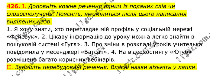 І. Доповніть кожне речення одним із поданих слів чи словосполучень. Поясніть, як зміниться після цього написання виділених назв. 1. Я хочу знати, хто переглядає мій профіль у соціальній мережі «Фейсбук». 2. Цікаву інформацію до уроку можна легко знайти в пошуковій системі «Гугл». 3. Про зміни в розкладі уроків учителька повідомила у месенджері «Ватсап». 4. На відеохостингу «Ютуб» розміщено багато корисних вебінарів. II. Запишіть перебудовані речення. Власні назви візьміть у лапки.