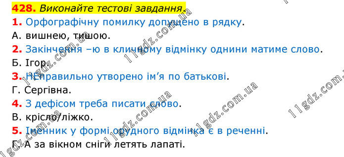 Виконайте тестові завдання. 1. Орфографічну помилку допущено в рядку. А. вишнею, тишою. 2. Закінчення –ю в кличному відмінку однини матиме слово. Б. Ігор. 3. НЕправильно утворено ім’я по батькові. Г. Сергівна. 4. З дефісом треба писати слово. В. крісло/ліжко. 5. Іменник у формі орудного відмінка є в реченні. Г. А за вікном сніги летять лапаті.