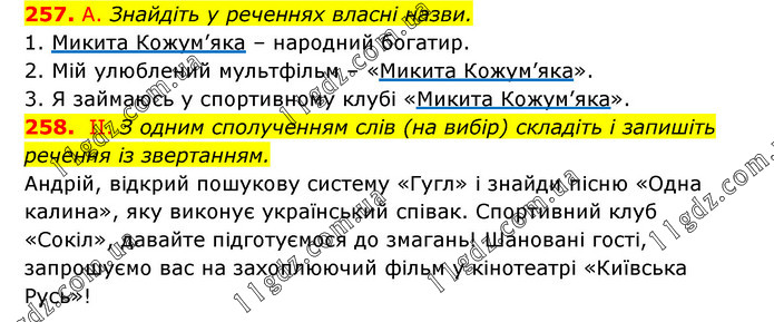 257. А. Знайдіть у реченнях власні назви. 1. Микита Кожум’яка – народний богатир. 2. Мій улюблений мультфільм – «Микита Кожум’яка». 3. Я займаюсь у спортивному клубі «Микита Кожум’яка». 258. II. З одним сполученням слів (на вибір) складіть і запишіть речення із звертанням. Андрій, відкрий пошукову систему «Гугл» і знайди пісню «Одна калина», яку виконує український співак. Спортивний клуб «Сокіл», давайте підготуємося до змагань! Шановані гості, запрошуємо вас на захоплюючий фільм у кінотеатрі «Київська Русь»!