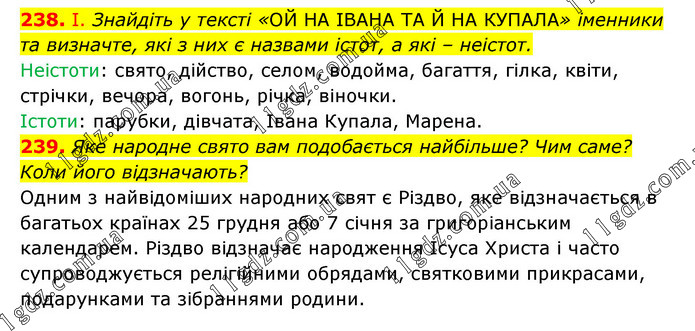 238. І. Знайдіть у тексті «ОЙ НА ІВАНА ТА Й НА КУПАЛА» іменники та визначте, які з них є назвами істот, а які – неістот. Неістоти: свято, дійство, селом, водойма, багаття, гілка, квіти, стрічки, вечора, вогонь, річка, віночки. Істоти: парубки, дівчата, Івана Купала, Марена. 239. Яке народне свято вам подобається найбільше? Чим саме? Коли його відзначають? Одним з найвідоміших народних свят є Різдво, яке відзначається в багатьох країнах 25 грудня або 7 січня за григоріанським календарем. Різдво відзначає народження Ісуса Христа і часто супроводжується релігійними обрядами, святковими прикрасами, подарунками та зібраннями родини.