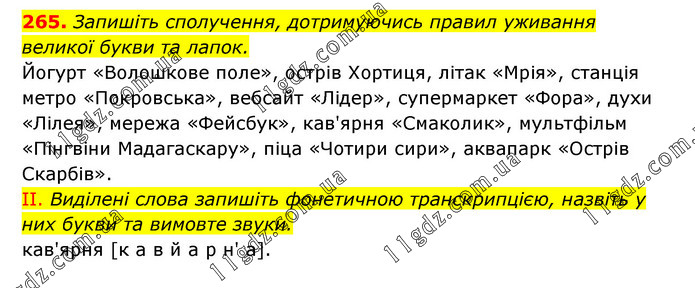 Запишіть сполучення, дотримуючись правил уживання великої букви та лапок. Йогурт «Волошкове поле», острів Хортиця, літак «Мрія», станція метро «Покровська», вебсайт «Лідер», супермаркет «Фора», духи «Лілея», мережа «Фейсбук», кав'ярня «Смаколик», мультфільм «Пінгвіни Мадагаскару», піца «Чотири сири», аквапарк «Острів Скарбів». II. Виділені слова запишіть фонетичною транскрипцією, назвіть у них букви та вимовте звуки. кав'ярня [к а в й а р н' а].