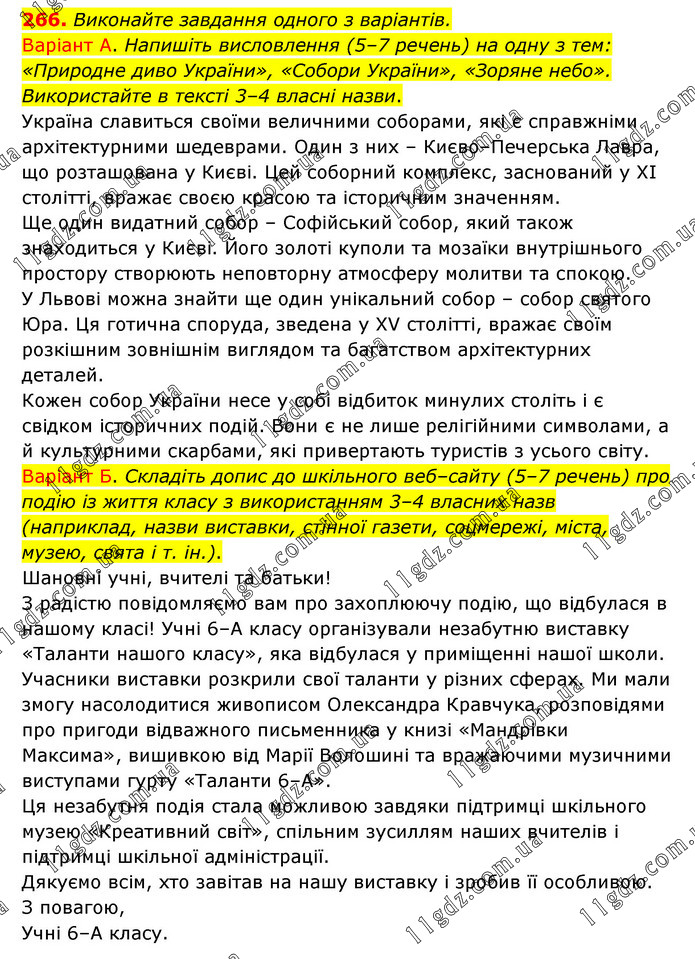Виконайте завдання одного з варіантів. Варіант А. Напишіть висловлення (5–7 речень) на одну з тем: «Природне диво України», «Собори України», «Зоряне небо». Використайте в тексті 3–4 власні назви. Україна славиться своїми величними соборами, які є справжніми архітектурними шедеврами. Один з них – Києво–Печерська Лавра, що розташована у Києві. Цей соборний комплекс, заснований у XI столітті, вражає своєю красою та історичним значенням. Ще один видатний собор – Софійський собор, який також знаходиться у Києві. Його золоті куполи та мозаїки внутрішнього простору створюють неповторну атмосферу молитви та спокою. У Львові можна знайти ще один унікальний собор – собор святого Юра. Ця готична споруда, зведена у XV столітті, вражає своїм розкішним зовнішнім виглядом та багатством архітектурних деталей. Кожен собор України несе у собі відбиток минулих століть і є свідком історичних подій. Вони є не лише релігійними символами, а й культурними скарбами, які привертають туристів з усього світу. Варіант Б. Складіть допис до шкільного веб–сайту (5–7 речень) про подію із життя класу з використанням 3–4 власних назв (наприклад, назви виставки, стінної газети, соцмережі, міста, музею, свята і т. ін.). Шановні учні, вчителі та батьки! З радістю повідомляємо вам про захоплюючу подію, що відбулася в нашому класі! Учні 6–А класу організували незабутню виставку «Таланти нашого класу», яка відбулася у приміщенні нашої школи. Учасники виставки розкрили свої таланти у різних сферах. Ми мали змогу насолодитися живописом Олександра Кравчука, розповідями про пригоди відважного письменника у книзі «Мандрівки Максима», вишивкою від Марії Волошині та вражаючими музичними виступами гурту «Таланти 6–А». Ця незабутня подія стала можливою завдяки підтримці шкільного музею «Креативний світ», спільним зусиллям наших вчителів і підтримці шкільної адміністрації. Дякуємо всім, хто завітав на нашу виставку і зробив її особливою. З повагою, Учні 6–А класу.