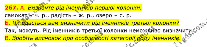 А. Визначте рід іменників першої колонки. самокат – ч. р., радість – ж. р., озеро – с. р. Б. Чи вдасться вам визначити рід іменників третьої колонки? Так, можуть. Рід іменників третьої колонки неможливо визначити. В. Зробіть висновок про особливості категорії роду іменників.