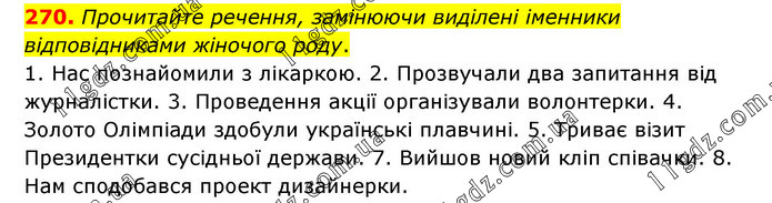Прочитайте речення, замінюючи виділені іменники відповідниками жіночого роду. 1. Нас познайомили з лікаркою. 2. Прозвучали два запитання від журналістки. 3. Проведення акції організували волонтерки. 4. Золото Олімпіади здобули українські плавчині. 5. Триває візит Президентки сусідньої держави. 7. Вийшов новий кліп співачки. 8. Нам сподобався проект дизайнерки.