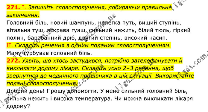 271. І. Запишіть словосполучення, добираючи правильне закінчення. Головний біль, новий шампунь, нелегка путь, вищий ступінь, вітальна туш, яскрава гуаш, сильний нежить, білий тюль, гіркий полин, барабанний дріб, другий степінь, високий насип. II. Складіть речення з одним поданим словосполученням. Маму турбував головний біль. 272. Уявіть, що хтось застудився, потрібно зателефонувати й викликати додому лікаря. Складіть усно 2–3 речення, щоб звернутися до медичного працівника в цій ситуації. Використайте подані словосполучення. Добрий день! Прошу допомогти. У мене сильний головний біль, сильна нежить і висока температура. Чи можна викликати лікаря додому?