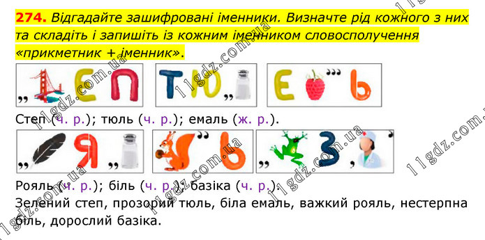 Відгадайте зашифровані іменники. Визначте рід кожного з них та складіть і запишіть із кожним іменником словосполучення «прикметник + іменник». Степ (ч. р.); тюль (ч. р.); емаль (ж. р.). Рояль (ч. р.); біль (ч. р.); базіка (ч. р.). Зелений степ, прозорий тюль, біла емаль, важкий рояль, нестерпна біль, дорослий базіка.