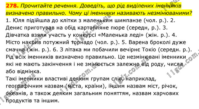 Прочитайте речення. Доведіть, що рід виділених іменників визначено правильно. Чому ці іменники називають незмінюваними? 1. Юля підійшла до клітки з маленьким шимпанзе (чол. р.). 2. Денис приготував на обід картопляне пюре (середн, р.). 3. Дівчатка взяли участь у конкурсі «Маленька леді» (жін. р.). 4. Місто накрив потужний торнадо (чол. р.). 5. Варена броколі дуже смачна (жін. р.). 6. З літака ми побачили вечірнє Токіо (середн. р.). Рід всіх іменників визначено правильно. Це незмінювані іменники які не мають закінчення і не змінюється залежно від роду, числа або відмінка. Такі іменники властиві деяким групам слів, наприклад, географічним назвам (міста, країни), іншим назвам міст, річок, океанів, а також деяким загальним поняттям, назвам харчових продуктів та іншим.