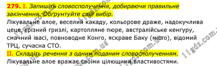 І. Запишіть словосполучення, добираючи правильне закінчення. Обґрунтуйте свій вибір. Лікувальне алое, веселий какаду, кольорове драже, надокучлива цеце, грізний гризлі, картопляне пюре, австралійське кенгуру, смачний івасі, повноводне Конго, яскраве Баку (місто), відомий ТРЦ, сучасна СТО. II. Складіть речення з одним поданим словосполученням. Лікувальне алое вражає своїми цілющими властивостями.