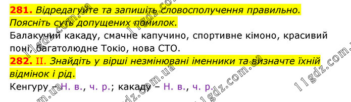 281. Відредагуйте та запишіть словосполучення правильно. Поясніть суть допущених помилок. Балакучий какаду, смачне капучино, спортивне кімоно, красивий поні, багатолюдне Токіо, нова СТО. 282. ІІ. Знайдіть у вірші незмінювані іменники та визначте їхній відмінок і рід. Кенгуру – Н. в., ч. р.; какаду – Н. в., ч. р.