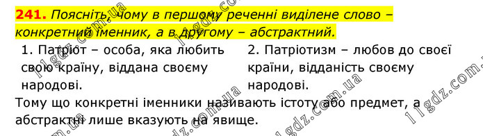 Поясніть, чому в першому реченні виділене слово – конкретний іменник, а в другому – абстрактний. 1. Патріот – особа, яка любить свою країну, віддана своєму народові. 2. Патріотизм – любов до своєї країни, відданість своєму народові. Тому що конкретні іменники називають істоту або предмет, а абстрактні лише вказують на явище.