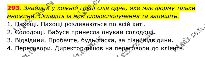 Знайдіть у кожній групі слів одне, яке має форму тільки множини. Складіть із ним словосполучення та запишіть. 1. Пахощі. Пахощі розливаються по всій хаті. 2. Солодощі. Бабуся принесла онукам солодощі. 3. Відвідини. Пробачте, будь ласка, за пізні відвідини. 4. Переговори. Директор пішов на переговори до клієнта.