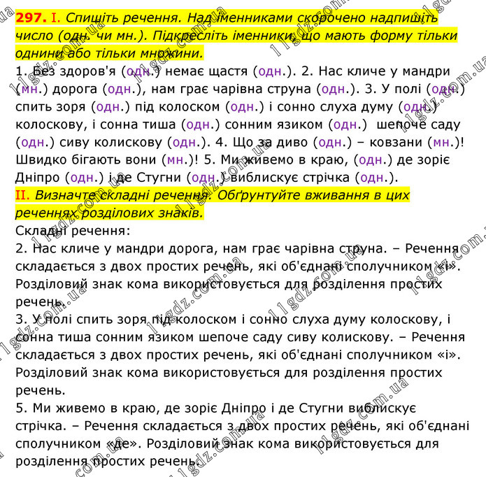 І. Спишіть речення. Над іменниками скорочено надпишіть число (одн. чи мн.). Підкресліть іменники, що мають форму тільки однини або тільки множини. 1. Без здоров'я (одн.) немає щастя (одн.). 2. Нас кличе у мандри (мн.) дорога (одн.), нам грає чарівна струна (одн.). 3. У полі (одн.) спить зоря (одн.) під колоском (одн.) і сонно слуха думу (одн.) колоскову, і сонна тиша (одн.) сонним язиком (одн.) шепоче саду (одн.) сиву колискову (одн.). 4. Що за диво (одн.) – ковзани (мн.)! Швидко бігають вони (мн.)! 5. Ми живемо в краю, (одн.) де зоріє Дніпро (одн.) і де Стугни (одн.) виблискує стрічка (одн.). II. Визначте складні речення. Обґрунтуйте вживання в цих реченнях розділових знаків. Складні речення: 2. Нас кличе у мандри дорога, нам грає чарівна струна. – Речення складається з двох простих речень, які об'єднані сполучником «і». Розділовий знак кома використовується для розділення простих речень. 3. У полі спить зоря під колоском і сонно слуха думу колоскову, і сонна тиша сонним язиком шепоче саду сиву колискову. – Речення складається з двох простих речень, які об'єднані сполучником «і». Розділовий знак кома використовується для розділення простих речень. 5. Ми живемо в краю, де зоріє Дніпро і де Стугни виблискує стрічка. – Речення складається з двох простих речень, які об'єднані сполучником «де». Розділовий знак кома використовується для розділення простих речень.