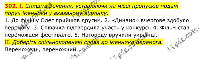І. Спишіть речення, уставляючи на місці пропусків подані поруч іменники у вказаному відмінку. 1. До фінішу Олег прийшов другим. 2. «Динамо» вчергове здобуло перемогу. 3. Співачка підтвердила участь у конкурсі. 4. Фільм став переможцем фестивалю. 5. Нагороду вручили українці. II. Доберіть спільнокореневі слова до іменника перемога. Переможець, переможний.