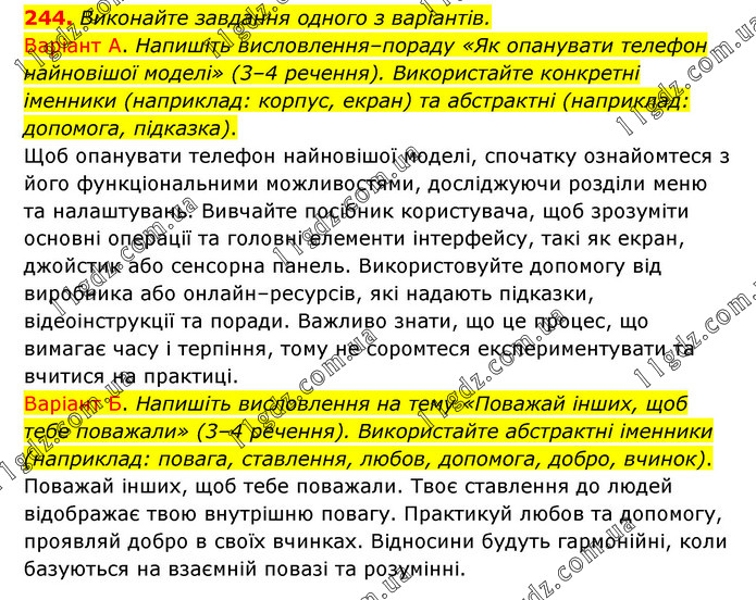 Виконайте завдання одного з варіантів. Варіант А. Напишіть висловлення–пораду «Як опанувати телефон найновішої моделі» (3–4 речення). Використайте конкретні іменники (наприклад: корпус, екран) та абстрактні (наприклад: допомога, підказка). Щоб опанувати телефон найновішої моделі, спочатку ознайомтеся з його функціональними можливостями, досліджуючи розділи меню та налаштувань. Вивчайте посібник користувача, щоб зрозуміти основні операції та головні елементи інтерфейсу, такі як екран, джойстик або сенсорна панель. Використовуйте допомогу від виробника або онлайн–ресурсів, які надають підказки, відеоінструкції та поради. Важливо знати, що це процес, що вимагає часу і терпіння, тому не соромтеся експериментувати та вчитися на практиці. Варіант Б. Напишіть висловлення на тему «Поважай інших, щоб тебе поважали» (3–4 речення). Використайте абстрактні іменники (наприклад: повага, ставлення, любов, допомога, добро, вчинок). Поважай інших, щоб тебе поважали. Твоє ставлення до людей відображає твою внутрішню повагу. Практикуй любов та допомогу, проявляй добро в своїх вчинках. Відносини будуть гармонійні, коли базуються на взаємній повазі та розумінні.
