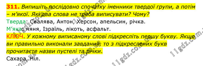 Випишіть послідовно спочатку іменники твердої групи, а потім – м’якої. Які два слова не треба виписувати? Чому? Тверда: Свалява, Антон, Херсон, апельсин, річка. М’яка: няня, Ізраїль, лікоть, асфальт. КЛЮЧ. У кожному виписаному слові підкресліть першу букву. Якщо ви правильно виконали завдання, то з підкреслених букв прочитаєте назви пустелі та річки. Сахара, Ніл.