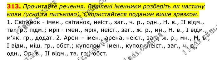 Прочитайте речення. Виділені іменники розберіть як частину мови (усно та письмово). Скористайтеся поданим вище зразком. 1. Світанок - імен., світанок, неіст., заг., ч. р., одн., Н. в., II відм., тв. гр., підм.; мрії - імен., мрія, неіст., заг., ж. р., мн., Н. в., I відм., м’як. гр., додат. 2. Арені - імен., арена, неіст., заг., ж. р., мн., М. в., I відм., міш. гр., обст.; куполом - імен., купол, неіст., заг., ч. р., одн., Ор. в., IІ відм., тв. гр., обст.
