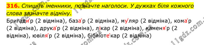 Спишіть іменники, позначте наголоси. У дужках біля кожного слова зазначте відміну. Бригади՛р (2 відміна), база՛р (2 відміна), му՛ляр (2 відміна), кома՛р (2 відміна), друка՛р (2 відміна), лікар (2 відміна), каменя՛р (2 відміна), ювіля՛р (2 відміна), бібліоте՛кар (2 відміна)