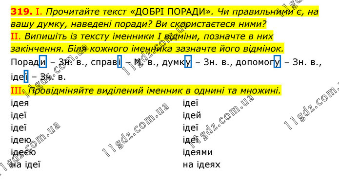І. Прочитайте текст «ДОБРІ ПОРАДИ». Чи правильними є, на вашу думку, наведені поради? Ви скористаєтеся ними? II. Випишіть із тексту іменники І відміни, позначте в них закінчення. Біля кожного іменника зазначте його відмінок. Поради – Зн. в., справі – М. в., думку – Зн. в., допомогу – Зн. в., ідеї – Зн. в. III. Провідміняйте виділений іменник в однині та множині. ідея ідеї ідеї ідею ідеєю на ідеї ідеї ідей ідеї ідеї ідеями на ідеях