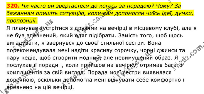 Чи часто ви звертаєтеся до когось за порадою? Чому? За бажанням опишіть ситуацію, коли вам допомогли чиїсь ідеї, думки, пропозиції. Я планував зустрітися з друзями на вечірці в місцевому клубі, але я не був впевнений, який одяг підібрати. Замість того, щоб щось вигадувати, я звернувся до своєї стильної сестри. Вона порекомендувала мені надіти красиву сорочку, чорні джинси та пару кедів, щоб створити модний, але невимушений образ. Я послухав її поради і, коли прийшов на вечірку, отримав багато компліментів за свій вигляд. Порада моєї сестри виявилася доречною, оскільки допомогла мені відчувати себе комфортно і впевнено на цій вечірці.
