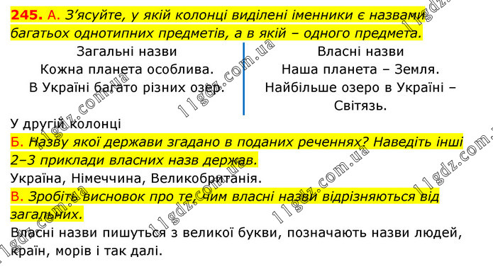 А. З’ясуйте, у якій колонці виділені іменники є назвами багатьох однотипних предметів, а в якій – одного предмета. Загальні назви Кожна планета особлива. В Україні багато різних озер. Власні назви Наша планета – Земля. Найбільше озеро в Україні – Світязь. У другій колонці Б. Назву якої держави згадано в поданих реченнях? Наведіть інші 2–3 приклади власних назв держав. Україна, Німеччина, Великобританія. В. Зробіть висновок про те, чим власні назви відрізняються від загальних. Власні назви пишуться з великої букви, позначають назви людей, країн, морів і так далі.