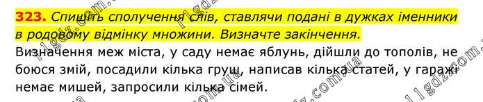 Спишіть сполучення слів, ставлячи подані в дужках іменники в родовому відмінку множини. Визначте закінчення. Визначення меж міста, у саду немає яблунь, дійшли до тополів, не боюся змій, посадили кілька груш, написав кілька статей, у гаражі немає мишей, запросили кілька сімей.