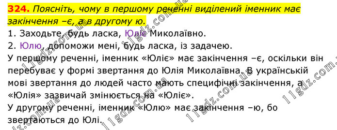 Поясніть, чому в першому реченні виділений іменник має закінчення –є, а в другому ю. 1. Заходьте, будь ласка, Юліє Миколаївно. 2. Юлю, допоможи мені, будь ласка, із задачею. У першому реченні, іменник «Юліє» має закінчення –є, оскільки він перебуває у формі звертання до Юлія Миколаївна. В українській мові звертання до людей часто мають специфічні закінчення, а «Юлія» зазвичай змінюється на «Юліє». У другому реченні, іменник «Юлю» має закінчення –ю, бо звертаються до Юлі.