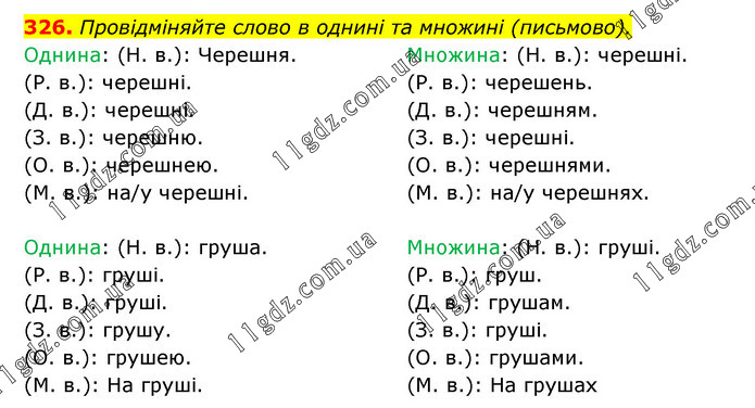 Провідміняйте слово в однині та множині (письмово). Однина: (Н. в.): Черешня. (Р. в.): черешні. (Д. в.): черешні. (З. в.): черешню. (О. в.): черешнею. (М. в.): на/у черешні. Множина: (Н. в.): черешні. (Р. в.): черешень. (Д. в.): черешням. (З. в.): черешні. (О. в.): черешнями. (М. в.): на/у черешнях. Однина: (Н. в.): груша. (Р. в.): груші. (Д. в.): груші. (З. в.): грушу. (О. в.): грушею. (М. в.): На груші. Множина: (Н. в.): груші. (Р. в.): груш. (Д. в.): грушам. (З. в.): груші. (О. в.): грушами. (М. в.): На грушах