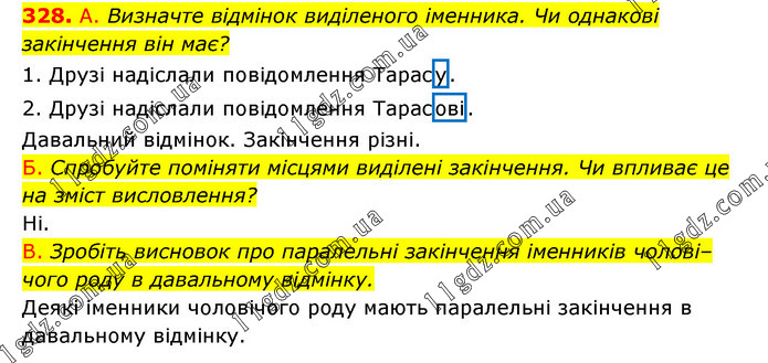 А. Визначте відмінок виділеного іменника. Чи однакові закінчення він має? 1. Друзі надіслали повідомлення Тарасу. 2. Друзі надіслали повідомлення Тарасові. Давальний відмінок. Закінчення різні. Б. Спробуйте поміняти місцями виділені закінчення. Чи впливає це на зміст висловлення? Ні. В. Зробіть висновок про паралельні закінчення іменників чолові–чого роду в давальному відмінку. Деякі іменники чоловічого роду мають паралельні закінчення в давальному відмінку.
