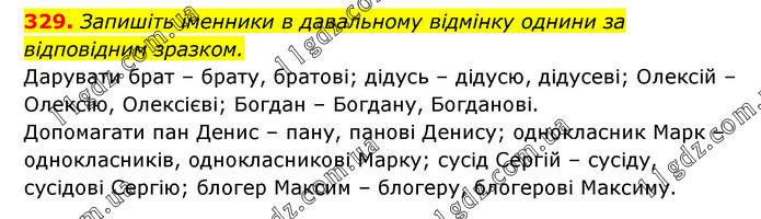 Запишіть іменники в давальному відмінку однини за відповідним зразком. Дарувати брат – брату, братові; дідусь – дідусю, дідусеві; Олексій – Олексію, Олексієві; Богдан – Богдану, Богданові. Допомагати пан Денис – пану, панові Денису; однокласник Марк – однокласників, однокласникові Марку; сусід Сергій – сусіду, сусідові Сергію; блогер Максим – блогеру, блогерові Максиму.