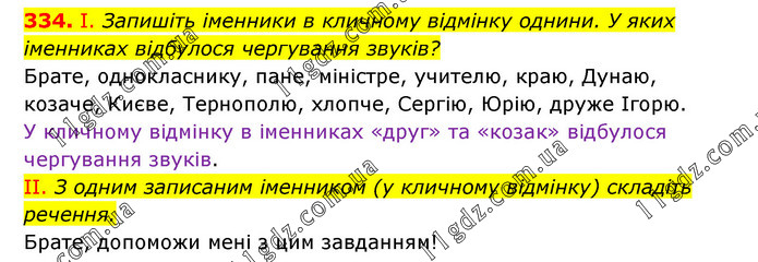 І. Запишіть іменники в кличному відмінку однини. У яких іменниках відбулося чергування звуків? Брате, однокласнику, пане, міністре, учителю, краю, Дунаю, козаче, Києве, Тернополю, хлопче, Сергію, Юрію, друже Ігорю. У кличному відмінку в іменниках «друг» та «козак» відбулося чергування звуків. II. З одним записаним іменником (у кличному відмінку) складіть речення. Брате, допоможи мені з цим завданням!