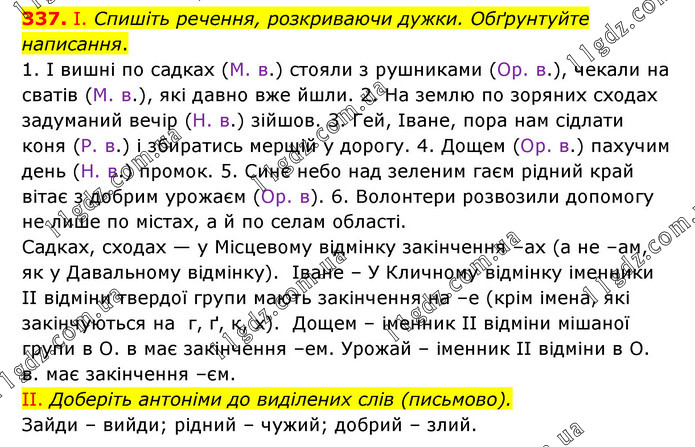 І. Спишіть речення, розкриваючи дужки. Обґрунтуйте написання. 1. І вишні по садках (М. в.) стояли з рушниками (Ор. в.), чекали на сватів (М. в.), які давно вже йшли. 2. На землю по зоряних сходах задуманий вечір (Н. в.) зійшов. 3. Гей, Іване, пора нам сідлати коня (Р. в.) і збиратись мерщій у дорогу. 4. Дощем (Ор. в.) пахучим день (Н. в.) промок. 5. Синє небо над зеленим гаєм рідний край вітає з добрим урожаєм (Ор. в). 6. Волонтери розвозили допомогу не лише по містах, а й по селам області. Садках, сходах — у Місцевому відмінку закінчення –ах (а не –ам, як у Давальному відмінку). Іване – У Кличному відмінку іменники ІІ відміни твердої групи мають закінчення на –е (крім імена, які закінчуються на г, ґ, к, х). Дощем – іменник ІІ відміни мішаної групи в О. в має закінчення –ем. Урожай – іменник ІІ відміни в О. в. має закінчення –єм. II. Доберіть антоніми до виділених слів (письмово). Зайди – вийди; рідний – чужий; добрий – злий.