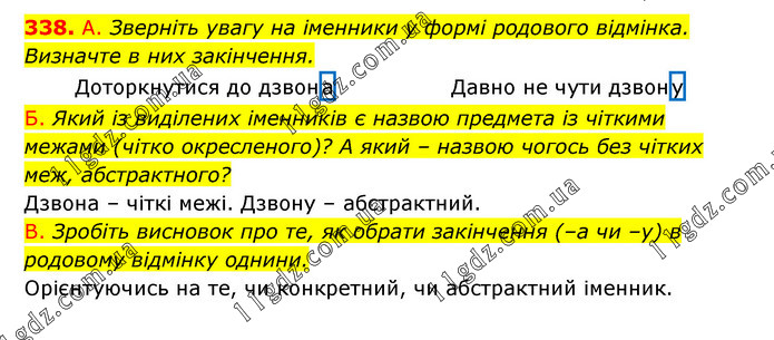 А. Зверніть увагу на іменники у формі родового відмінка. Визначте в них закінчення. Доторкнутися до дзвона Давно не чути дзвону Б. Який із виділених іменників є назвою предмета із чіткими межами (чітко окресленого)? А який – назвою чогось без чітких меж, абстрактного? Дзвона – чіткі межі. Дзвону – абстрактний. В. Зробіть висновок про те, як обрати закінчення (–а чи –у) в родовому відмінку однини. Орієнтуючись на те, чи конкретний, чи абстрактний іменник.