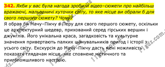 Якби у вас була нагода зробити відео–сюжети про найбільш вражаючі, мальовничі куточки світу, то яке місце ви обрали б для свого першого сюжету? Чому? Я обрав би Мачу–Пікчу в Перу для свого першого сюжету, оскільки це архітектурний шедевр, прихований серед гірських вершин і джунглів. Його унікальна краса, загадковість та культурне значення привертають палких шанувальників пригод і історії з усього світу. Екскурсія до Мачу–Пікчу дасть мені можливість показати глядачам місце, яке сповнене містичного та приголомшливого настрою.
