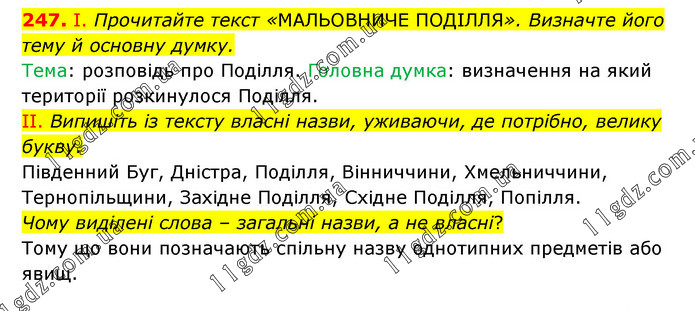 І. Прочитайте текст «МАЛЬОВНИЧЕ ПОДІЛЛЯ». Визначте його тему й основну думку. Тема: розповідь про Поділля. Головна думка: визначення на який території розкинулося Поділля. II. Випишіть із тексту власні назви, уживаючи, де потрібно, велику букву. Південний Буг, Дністра, Поділля, Вінниччини, Хмельниччини, Тернопільщини, Західне Поділля, Східне Поділля, Попілля. Чому виділені слова – загальні назви, а не власні? Тому що вони позначають спільну назву однотипних предметів або явищ.