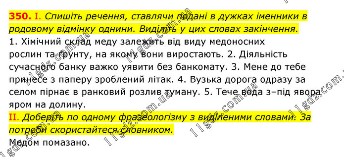 І. Спишіть речення, ставлячи подані в дужках іменники в родовому відмінку однини. Виділіть у цих словах закінчення. 1. Хімічний склад меду залежить від виду медоносних рослин та ґрунту, на якому вони виростають. 2. Діяльність сучасного банку важко уявити без банкомату. 3. Мене до тебе принесе з паперу зроблений літак. 4. Вузька дорога одразу за селом пірнає в ранковий розлив туману. 5. Тече вода з–під явора яром на долину. II. Доберіть по одному фразеологізму з виділеними словами. За потреби скористайтеся словником. Медом помазано.