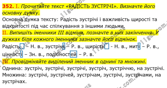 І. Прочитайте текст «РАДІСТЬ ЗУСТРІЧІ». Визначте його основну думку. Основна думка тексту: Радість зустрічі і важливість щирості та відкритості під час спілкування з іншими людьми. II. Випишіть іменники III відміни, позначте в них закінчення. У дужках біля кожного іменника зазначте його відмінок. Радість – Н. в., зустрічі – Р. в., щирість - Н. в., миті – Р. в., цінності – Зн. в., подібностей – Р. в. III. Провідміняйте виділений іменник в однині та множині. Однина: зустріч, зустрічі, зустрічі, зустріч, зустріччю, на зустрічі. Множина: зустрічі, зустрічей, зустрічам, зустрічі, зустрічами, на зустрічах.